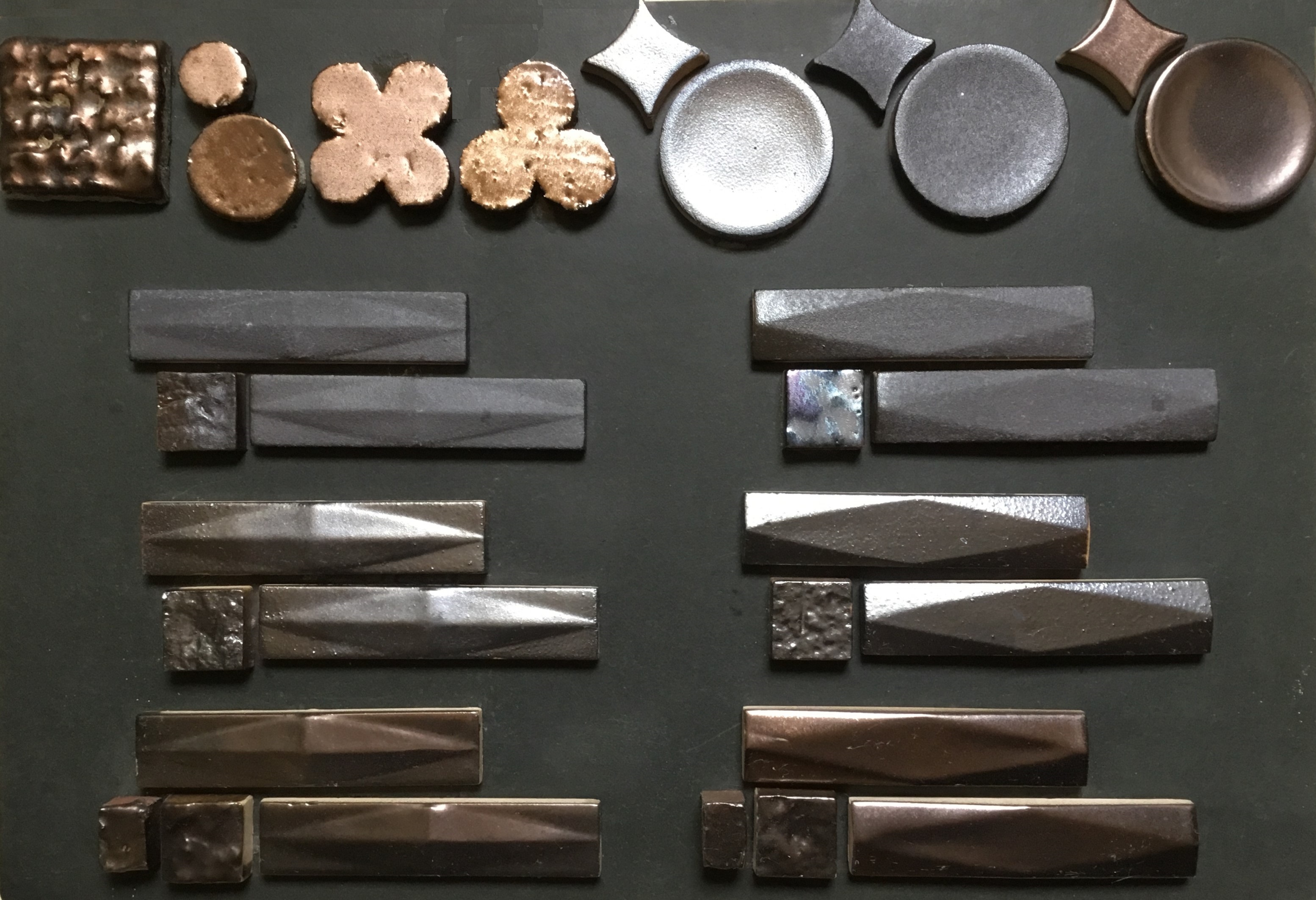 一般的にタイルでメタリックな色調を表現する場合、上絵二度焼成が用いられますが、今回ご紹介いたしますのは本焼成でメタリックな色調を再現したものです。