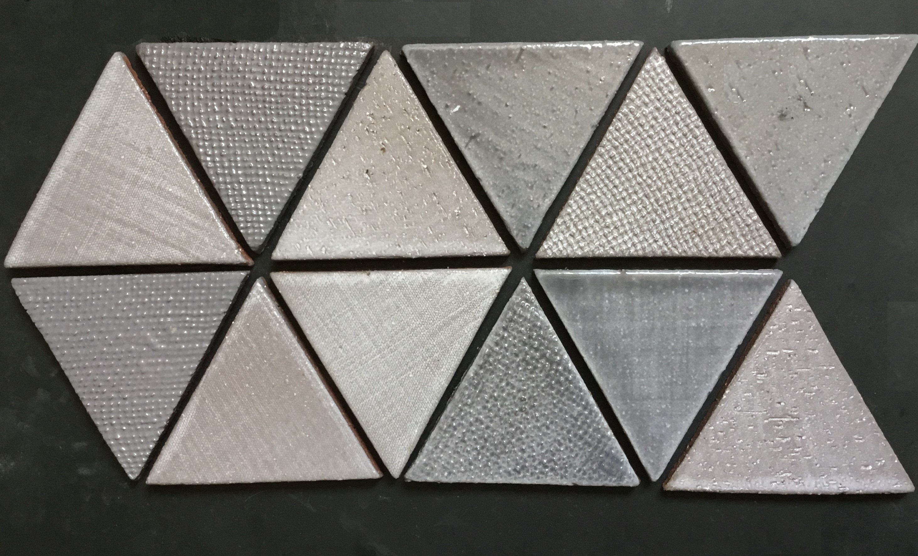 土練器から出てきた生地を、ピアノ線で三角に成形、布面とF面にプレスし乾燥、釉薬はグレー系の濃淡の釉薬で施釉・焼成して制作致しました。