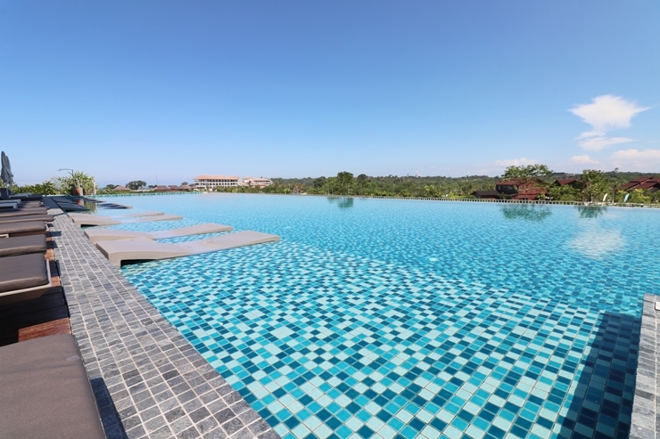 これだけ広大な面積のプールは見たことがないです。もはや自然の池のようです。ただ、左隅に映り込んだプールサイドの景色、そしてMIXで貼られたタイル等明らかに人工物です。不思議です。