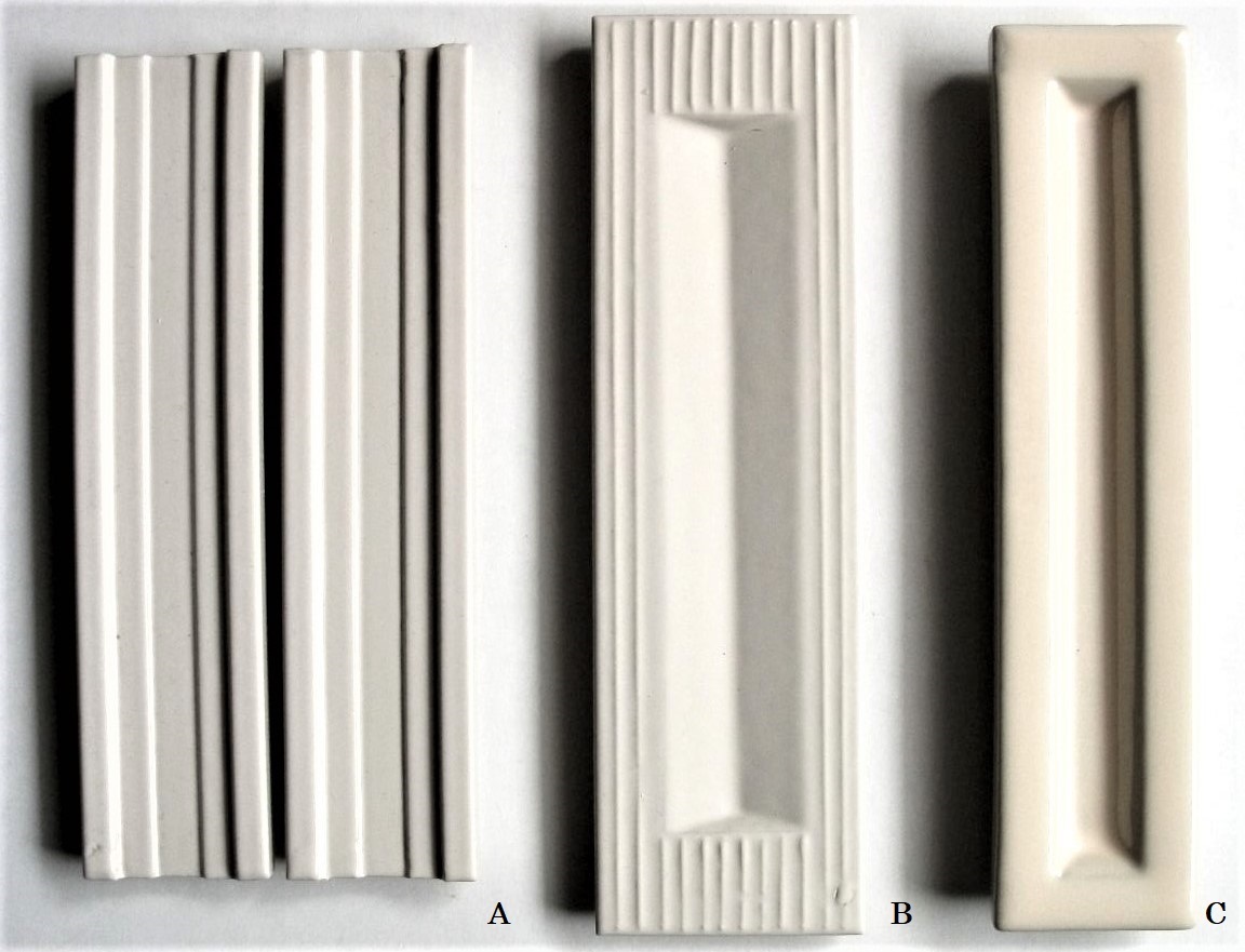 床には表面がノンスリップ加工された200角程度、腰壁が50角、その上が100角、区切りの壁は100mmの幅の大型ボーダー、湯船は100×20?mm程度のボーダー・白を基調に淡い色でまとめられていて、シンプルで清潔感があってなかなかいい感じです。