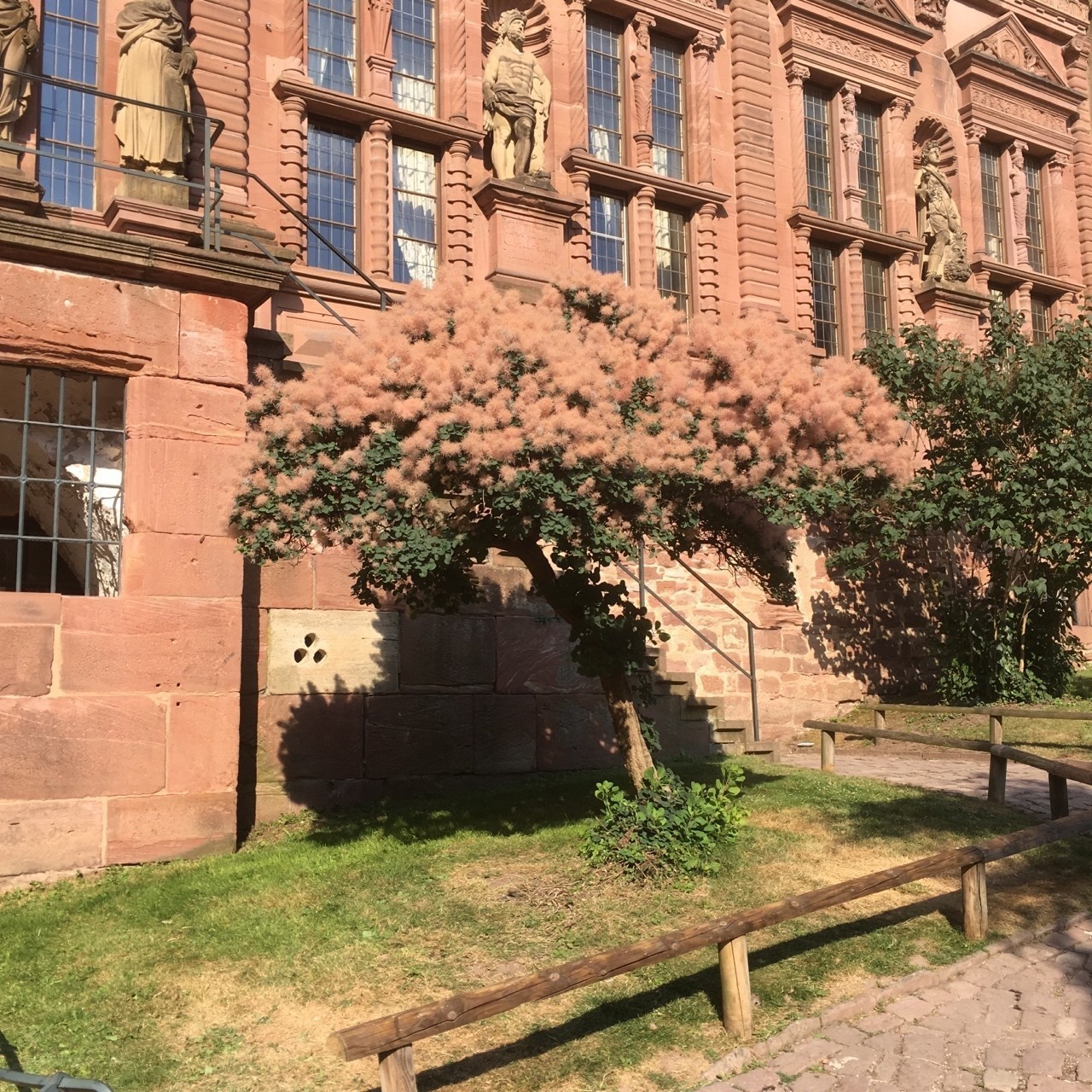 浅学な私には、花の種類は分かりませんが、この感じはとても不思議です。地面の色との対比、レンガ色の人口建造物の建築と天然の木、自然が作り上げた不思議な調和の一幕です。素敵です。