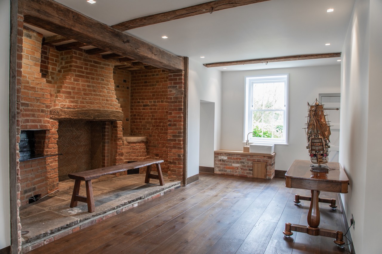 今回の画像はインテリアで、室内の一面にレンガ積みの大きな暖炉が鎮座しています。